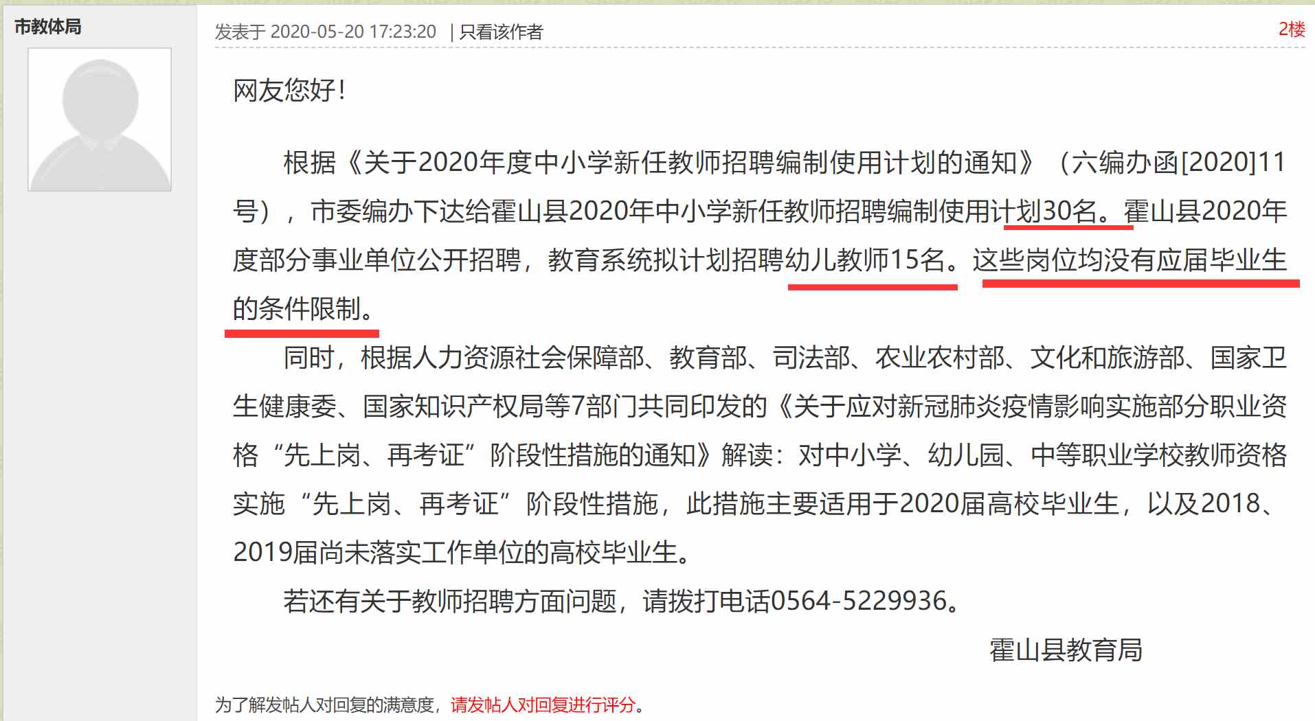 霍山縣教育局回復: