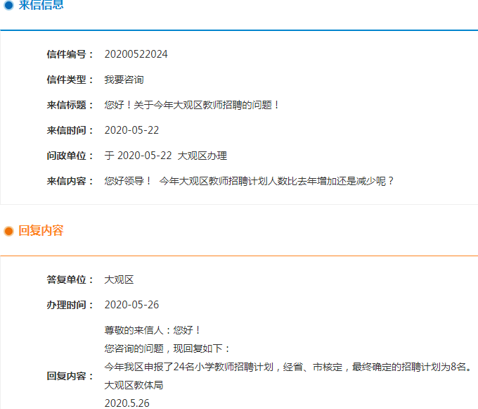 來信內(nèi)容:您好領(lǐng)導(dǎo)! 今年大觀區(qū)教師招聘計劃人數(shù)比去年增加還是減少呢?