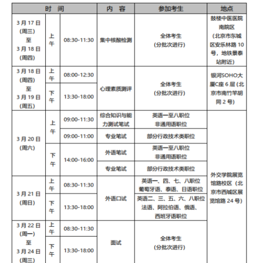 近年來,外交部的面試形式均為結(jié)構(gòu)化面試,面試時間為20-30分鐘,題量4-11題,考官讀題。除了面試之外,還需進(jìn)行相應(yīng)的專業(yè)能力測試和心理素質(zhì)測試,其中專業(yè)能力測試包括綜合知識與能力測試(筆試)、專業(yè)筆試、外語筆試、外語口試;心理素質(zhì)測試分批次進(jìn)行,不計(jì)入綜合成績。