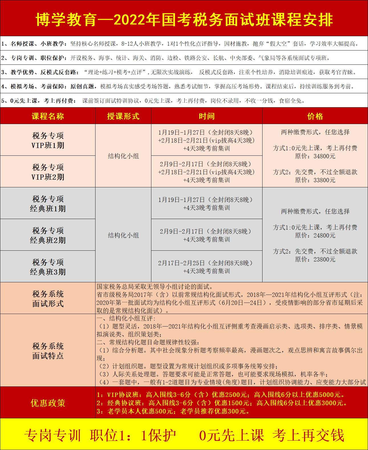 稅務(wù)局面試形式和特點(diǎn) 面試形式:國家稅務(wù)總局采取無領(lǐng)導(dǎo)小組討論的面試。 省市級稅務(wù)局2017年(含)以前常規(guī)結(jié)構(gòu)化面試形式,2018年—2021年結(jié)構(gòu)化小組互評形式(注:2020年第一批面試均為結(jié)構(gòu)化小組互評形式(6月20日—24日),受疫情影響的部分省市延期后采取的是常規(guī)結(jié)構(gòu)化面試)。 面試題量:結(jié)構(gòu)化小組互評每套題3道題目;常規(guī)結(jié)構(gòu)化面試每套題4道題目。 面試時(shí)間: (1)結(jié)構(gòu)化小組互評:15分鐘場外備考看題,進(jìn)入考場后,按要求每人依次答題,每道題目3分鐘(注:個(gè)人答題時(shí)間:2020年—2021年均為3分鐘,2018年—2019年均為2分鐘);全部答題結(jié)束,按要求展開互評,點(diǎn)評每人的時(shí)間為2分鐘;被點(diǎn)評人針對點(diǎn)評展開回應(yīng),時(shí)間2分鐘。 (2)常規(guī)結(jié)構(gòu)化面試:4道題目20分鐘,剩余3分鐘提醒時(shí)間。 (3)無領(lǐng)導(dǎo)討論:20分鐘場外備考看材料,然后進(jìn)入考場總時(shí)間85分鐘,首先個(gè)人陳述每人3分鐘,然后根據(jù)問題展開自由討論,最后推選一個(gè)代表作5分鐘陳述總結(jié)。 考查方式:看題+聽題相結(jié)合的 面試試題特點(diǎn) 第一、結(jié)構(gòu)化小組互評: (1)題型靈活,2018年—2021年結(jié)構(gòu)化小組互評側(cè)重考查漫畫啟示類、選項(xiàng)類、排序類、情景模擬演說類、組織策劃類; 第二、常規(guī)結(jié)構(gòu)化題目命題規(guī)律性較強(qiáng): (1)綜合分析題。其中社會現(xiàn)象分析題考察頻率最高,漫畫題次之,觀點(diǎn)思辨和寓言故事偶爾出現(xiàn); (2)計(jì)劃組織題。題型設(shè)置為常規(guī)計(jì)劃組織或多項(xiàng)事務(wù)統(tǒng)籌安排; (3)人際關(guān)系處理題。答題要求可能是正常答題,也可能要求現(xiàn)場模擬,機(jī)率各半; (4)一套題中,一般有1-2道題目為專業(yè)情境(角度)題目,計(jì)劃組織協(xié)調(diào)能力、應(yīng)變能力大部分試題為國稅專業(yè)情境題,綜合分析有少量的國稅專業(yè)角度題目,總體難度不大。