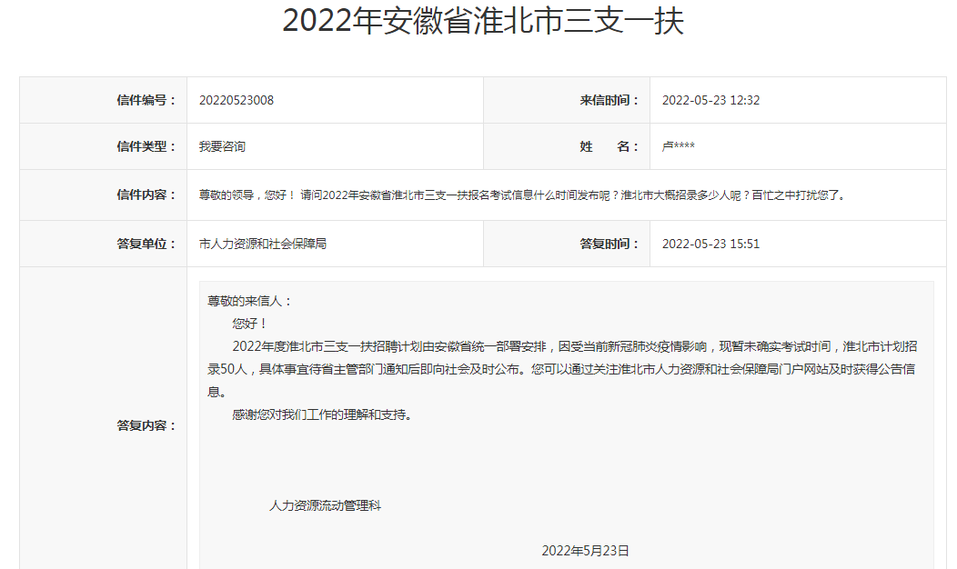 領(lǐng)導(dǎo),您好!請問2022年安徽省淮北市三支一扶報(bào)名考試信息什么時(shí)間發(fā)布呢?淮北市大概招錄多少人呢?百忙之中打擾您了。