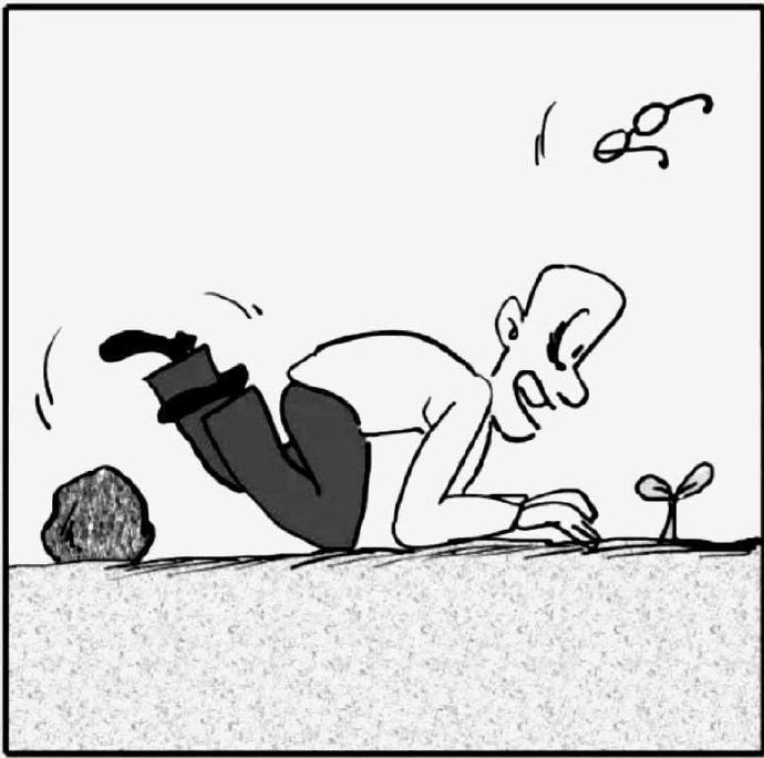 2、漫畫題:一個(gè)人被一塊石頭絆倒,眼鏡跌飛,眼睛緊盯著一個(gè)小樹(shù)苗。(如下圖)