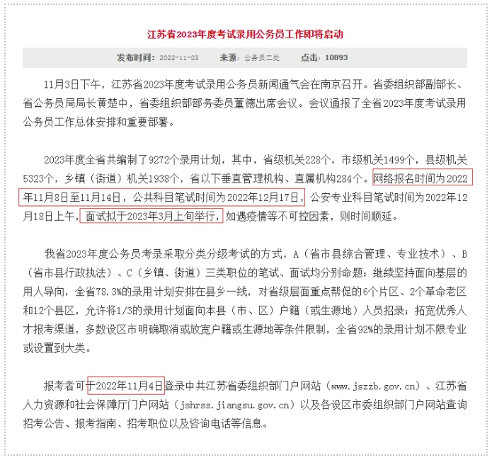 2023江蘇公務員考試消息已出,快來查收重要信息:招錄人數(shù):9272人,其中,省級機關228個,市級機關1499個,縣級機關5323個,鄉(xiāng)鎮(zhèn)(街道)機關1938個,省以下垂直管理機構、直屬機構284個。