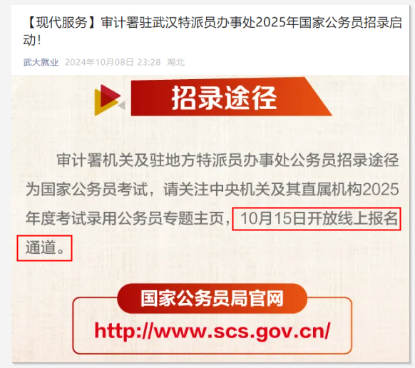 重要通知!2025年國考報(bào)名時(shí)間定啦!昨晚,武大就業(yè)發(fā)布《審計(jì)署駐武漢特派員辦事處2025年國家公務(wù)員招錄啟動!》,其中提到:2025國考將于10月15日開放報(bào)名通道。