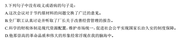 答案:C。解析:A項(xiàng),狀語(yǔ)和定語(yǔ)次序錯(cuò)位,應(yīng)改為廣泛地交換了意見。B項(xiàng),語(yǔ)序不當(dāng),應(yīng)改為全廠職工認(rèn)真聽取并討論了廠長(zhǎng)的報(bào)告。D項(xiàng),品質(zhì)是抽象概念,是不能浮現(xiàn)在腦海中的,不合邏輯。故這道題選C。