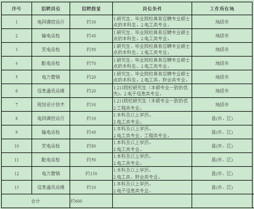 四、招聘流程 報名→資格審查→參加國家電網(wǎng)公司統(tǒng)一筆試→面試→擬錄取→審批→公示→體檢→簽約。 五、需求信息 1.招聘計劃:2018年公司招聘計劃約1000人(包括校園招聘和第一批、第二批集中招聘)。本批次約為600人。 2.用人單位及工作崗位 (1)用人單位 國網(wǎng)濟南供電公司等17家市供電公司,國網(wǎng)山東章丘市供電公司等98家縣供電公司,國網(wǎng)山東省電力公司電力科學(xué)研究院、國網(wǎng)山東省電力公司經(jīng)濟技術(shù)研究院、國網(wǎng)山東省電力公司檢修公司、山東送變電工程公司、國網(wǎng)山東省電力公司信息通信公司、山東魯能智能技術(shù)有限公司、山東魯能軟件技術(shù)有限公司等單位。 (2)工作崗位