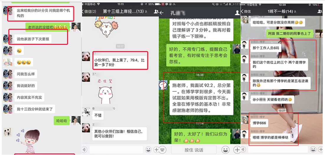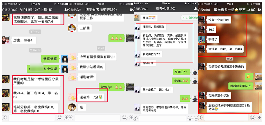 在2010年—2018年國(guó)考中,很多人僅僅是因?yàn)榭戳司W(wǎng)上博學(xué)教育公務(wù)員班的幾段視頻,就毫不猶豫地選擇博學(xué)教育,最終成功地實(shí)現(xiàn)了他們的公務(wù)員之夢(mèng)。2010年安徽省考高陽(yáng)同學(xué)面試取得88.4的高分,一舉從筆試第23名躍居為綜合排名第一名,成為巢湖市面試狀元;胡卓然同學(xué)以86分的成績(jī)勇奪南京市第一名,被南京市國(guó)土資源局錄取。廣東的鄭滋潤(rùn)同學(xué),數(shù)次公考面試失敗,2011年慕名來(lái)到博學(xué)施老師門(mén)下,經(jīng)過(guò)七天學(xué)習(xí),脫胎換骨,以91分的成績(jī)遙遙領(lǐng)先對(duì)手被財(cái)政部駐深圳市專員辦錄取!2011年安徽省考季毓同學(xué)面試取得88的高分,成為馬鞍市面試狀元;2012年上海的潘安安同學(xué),以88.3的高分被上海海關(guān)隸屬海關(guān)通關(guān)業(yè)務(wù)部門(mén)錄取。2013年福建的王子熙同學(xué),以89.4的高分被廈門(mén)海關(guān)廈門(mén)地區(qū)隸屬海關(guān)或辦事處錄取。2013年安徽省考牛園園同學(xué)取得面試86.8分,成為亳州市面試狀元!2014年安徽的曹珍同學(xué),以86.8的成績(jī)勇奪安徽省直面試狀元,被安徽省女子監(jiān)獄錄取。2015年國(guó)考安徽的曹燦同學(xué),以92.25分的成績(jī)被中國(guó)銀行業(yè)監(jiān)督管理委員會(huì)安徽監(jiān)管局錄?。?015年安徽省考陳雯同學(xué)以面試87.2的高分勇奪蕪湖市面試狀元;趙錦同學(xué)以面試86.4的高分取得天長(zhǎng)市面試狀元;查菁文同學(xué)以面試86的高分取得定遠(yuǎn)縣面試狀元。2016年國(guó)考面試,張雨豪以91分的成績(jī)被甘肅省國(guó)家稅務(wù)局錄取。2016年安徽省考陳蓉同學(xué)以面試86.8分取得馬鞍山市非鄉(xiāng)鎮(zhèn)公務(wù)員面試狀元;2017年國(guó)考,劉大偉勇奪山東省面試狀元,以98.67分被商務(wù)部錄??;阮帆同學(xué)面試取得91.33分,上海市國(guó)稅錄?。秽嵪胪瑢W(xué)面試取得90.3分,上海國(guó)稅錄;2017年安徽省考顧博賢同學(xué)以面試88分取得利辛縣非鄉(xiāng)鎮(zhèn)公務(wù)員面試狀元。2018年國(guó)考徐起以87.33分被中央國(guó)家機(jī)關(guān)工委錄取,夏鈺以88.33分被中國(guó)浦東干部學(xué)院錄取。2018年安徽省考,周陽(yáng)以83.8分取得銅陵市鄉(xiāng)鎮(zhèn)層級(jí)面試狀元;魏宇以82.8分取得亳州市鄉(xiāng)鎮(zhèn)層級(jí)面試狀元!