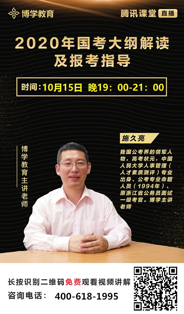 為了提高報(bào)名和備考的針對(duì)性和有效性,請(qǐng)鎖定10月15、16日晚19:00博學(xué)教育首席老師——施久亮老師2020國考報(bào)名指導(dǎo)及大綱解讀的騰訊直播課!你想知道的統(tǒng)統(tǒng)都會(huì)有,還可以實(shí)時(shí)互動(dòng)!